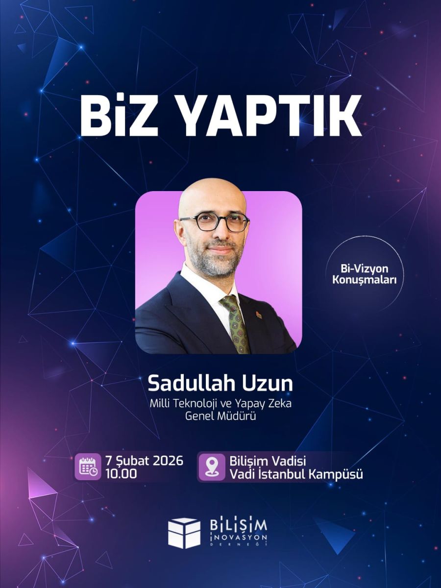 Bİ-Vizyon Konuşmaları serimizin ilk oturumunda Türkiye’nin teknoloji ve yapay zeka politikalarına yön veren Milli Teknoloji Genel Müdürü Sayın Sadullah Uzun'dan ülkemizin dijital geleceği ve teknoloji vizyonuna dair görüş ve hedeflerini dinleyeceğiz. Bu keyifli ve bilgilendirici söyleşiyi kaçırmamak ve bilişim sektöründeki her seviyeden katılımcılarla bir arada olmak için kayıt yaptırmayı unutmayın.